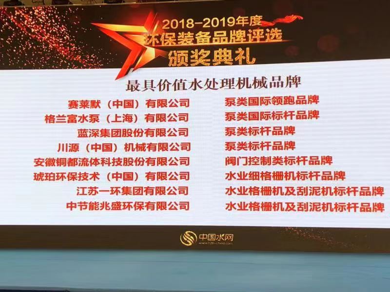 2019年8月17日,在上海舉辦的“2019(第十一屆)上海水業(yè)熱點論壇”暨“2018-2019年度價值環(huán)保裝備品牌”評選中,安徽銅都流體科技股份有限公司再次榮獲“2018-2019年度價值水處理機(jī)械品牌”。