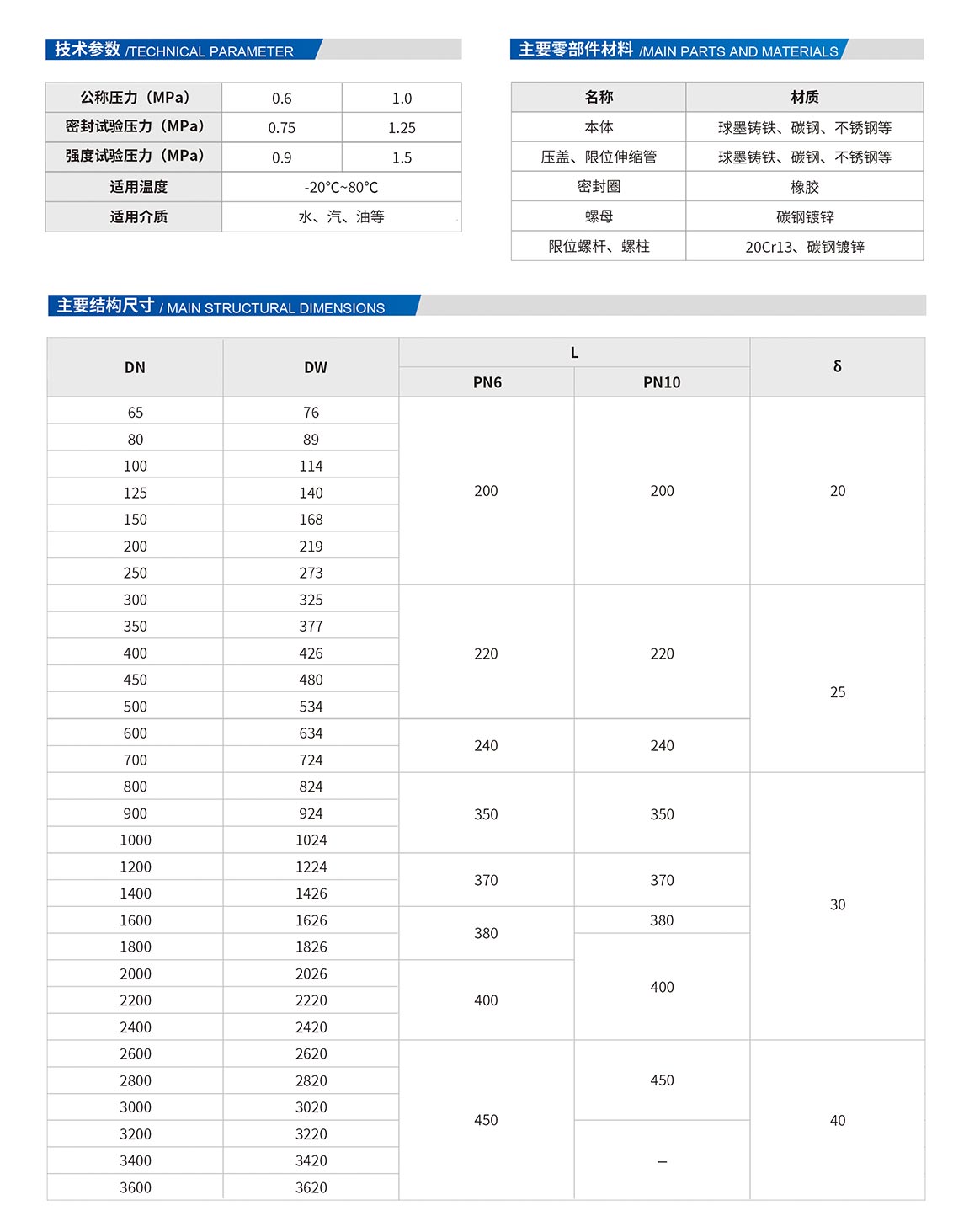 雙法蘭傳力接頭:由本體,密封圈,壓蓋,伸縮短管等主要部件組成。該產(chǎn)品適用于兩邊均為法蘭連接的管道中,安裝時調節(jié)產(chǎn)品兩端的法蘭的安裝長度,對角均勻擰緊壓蓋螺栓,使其成為一個整體,并有一定的調節(jié)量,方便安裝維修時,根據(jù)現(xiàn)場尺寸進行調整。在工作時可以反軸向推力傳遞至整個管道。雙法蘭傳力接頭是由法蘭松套伸縮接頭和短管法蘭,傳力螺桿等構件組成,能降低被連接件的壓力推力(盲板力)和補償管路安裝誤差。雙法蘭傳力接主要用于泵、閥門等附件的松套連接。
